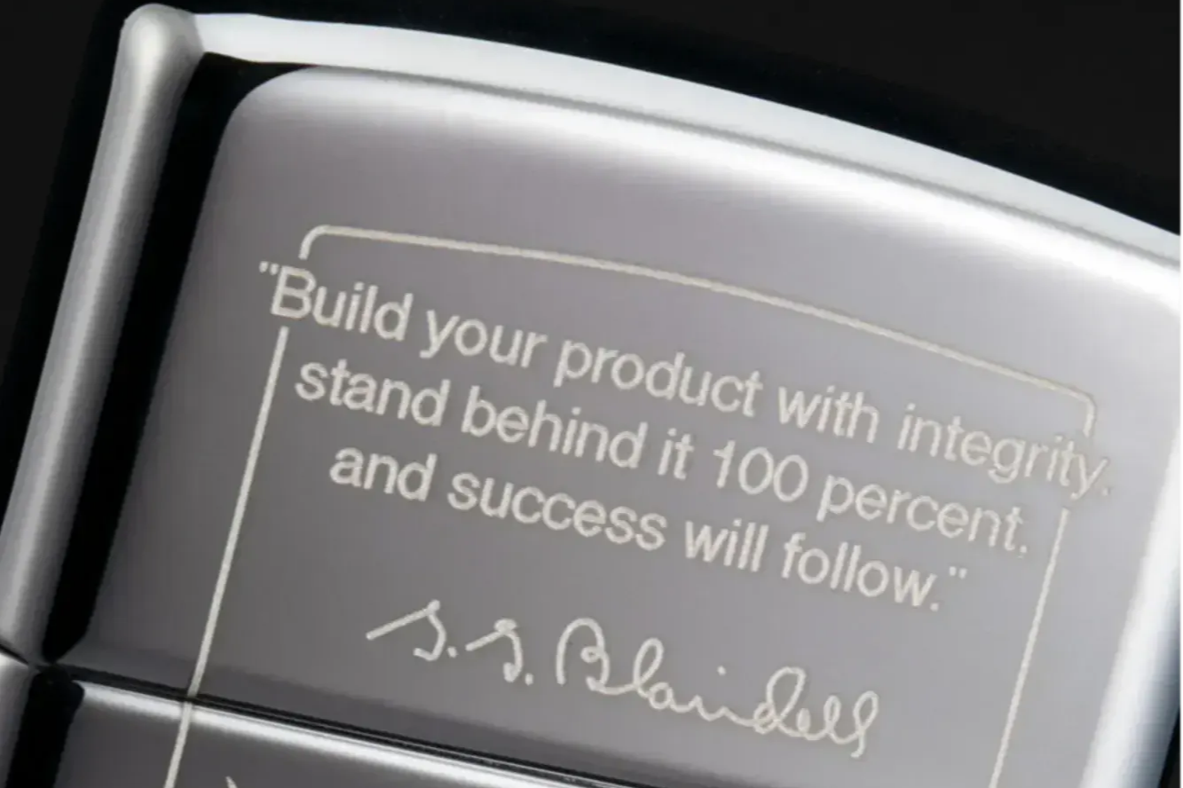 The back of the case features Zippo founder George G. Blaisdell’s iconic quote above his signature and portrait: “Build your product with integrity, stand behind it 100 percent, and success will follow.”