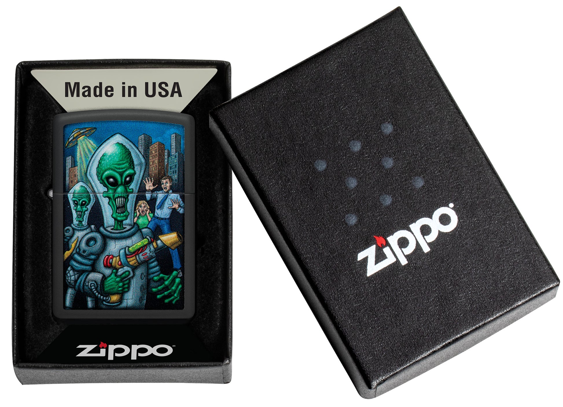 Extraterrestrial travelers make a not-so-subtle entrance on this otherworldly Black Matte lighter. Our Color Image process depicts a friendly pair of aliens kindly asking some Earthlings for directions to the Zippo/Case Museum in this wholesome two-sided design. Comes packaged in a gift box. For optimal performance fill with Zippo lighter fuel.