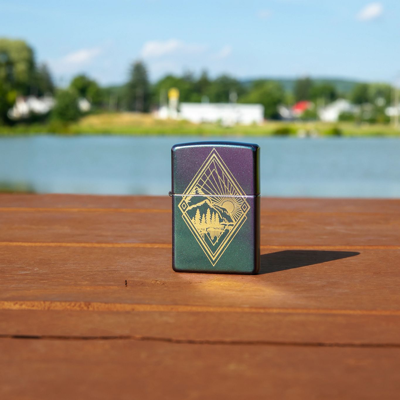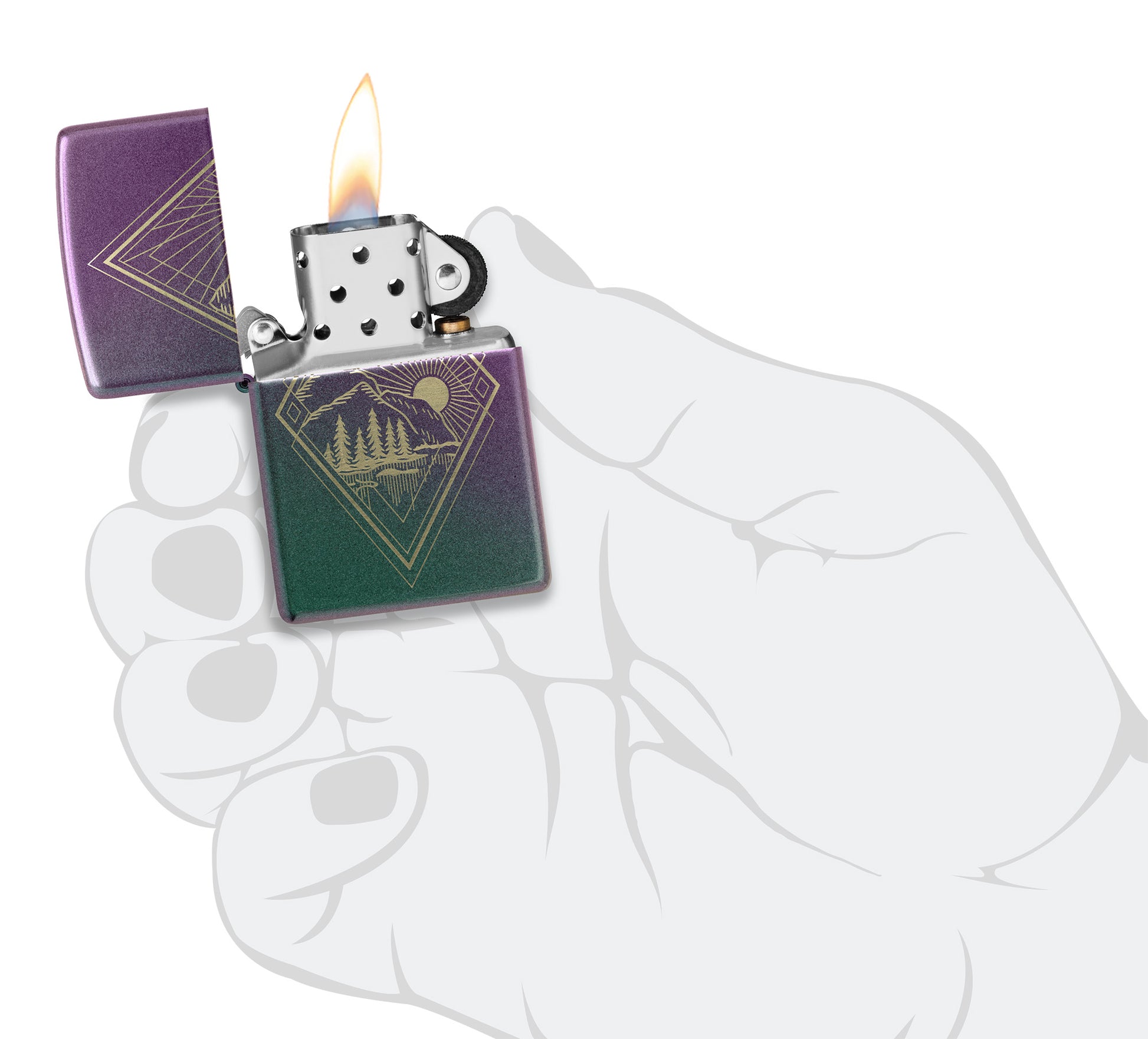 The mountains are calling, and this Iridescent lighter will help you answer that call (even if you're stuck indoors). The laser-engraved outdoor design stands in luxurious contrast on the satin ombré backdrop. Comes packaged in a gift box. For optimal performance fill with Zippo lighter fuel.