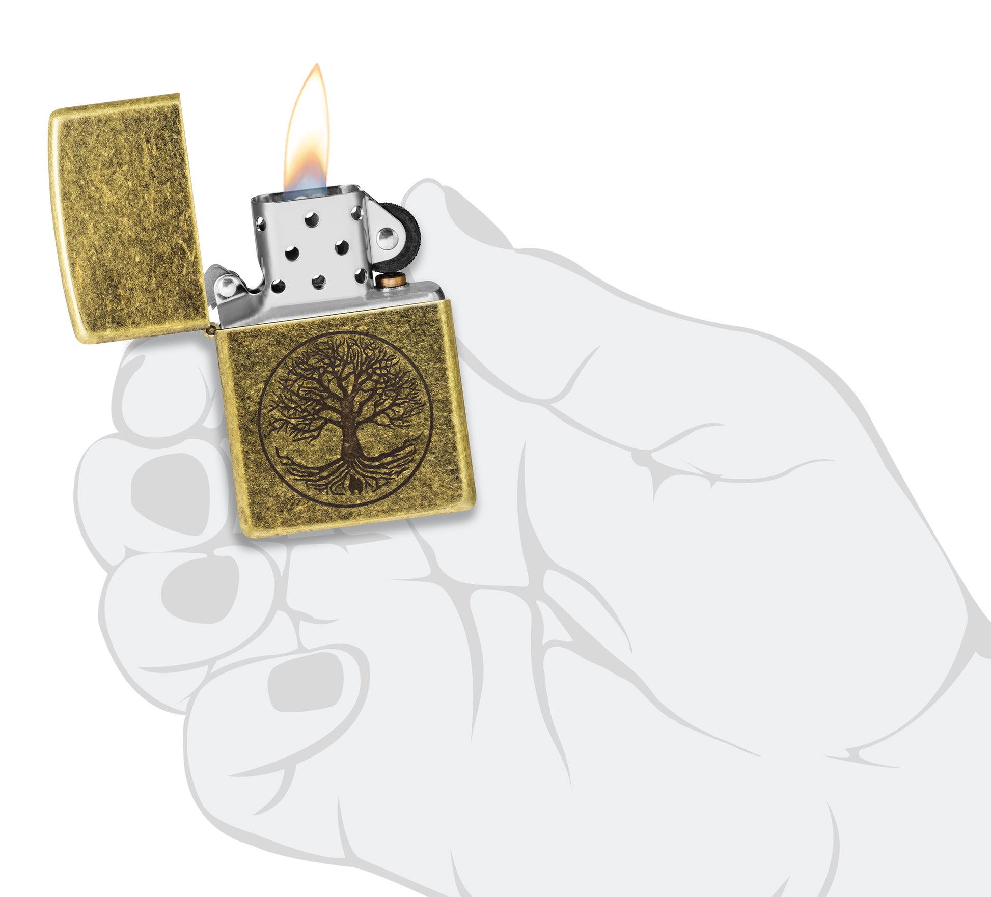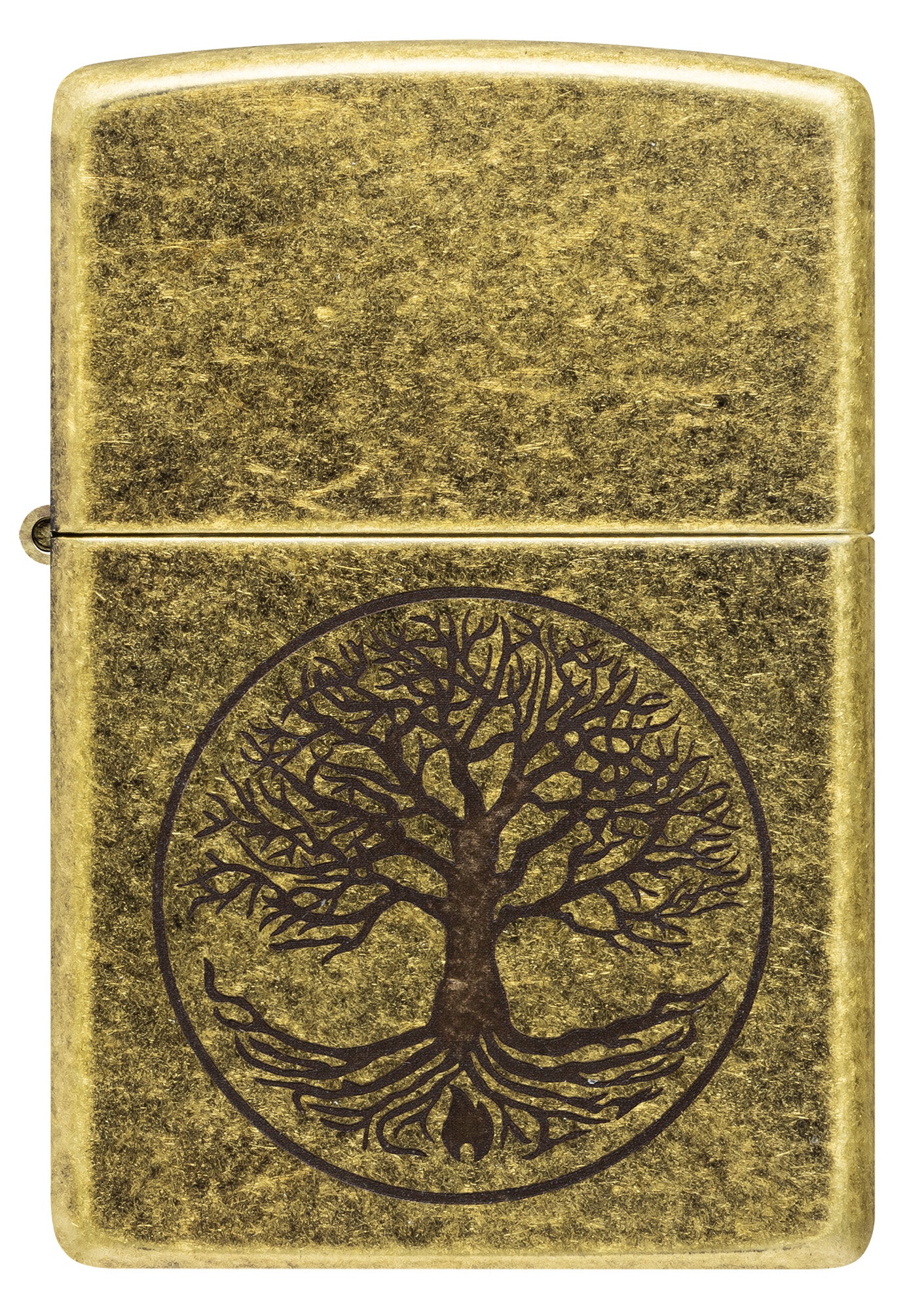 It's the Zippo tree of life. A growing tree decorates this Antique Brass™ lighter through the Lustre process, a small Zippo flame within its roots. Comes packaged in a gift box. For optimal performance, fill with Zippo lighter fuel.